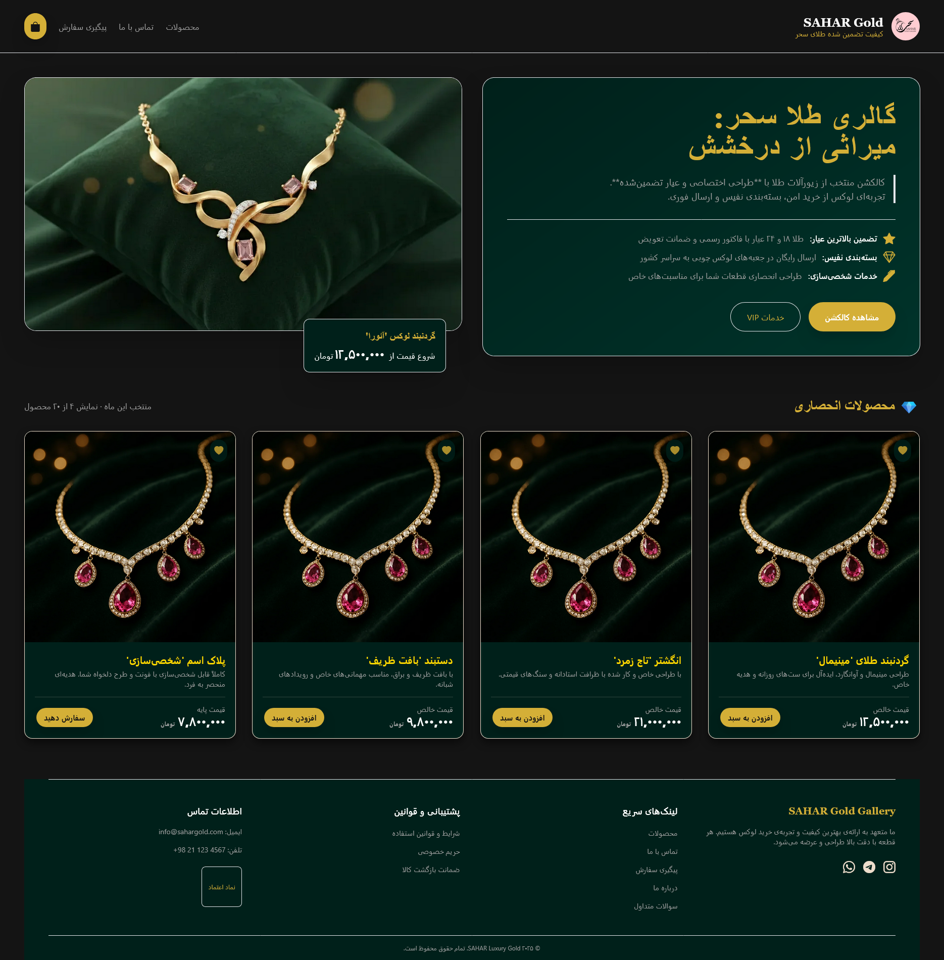 پروژه «گالری طلای سحر» اکنون آمادهی افزودن و نمایش صفحات مختلف از جمله صفحه اصلی، صفحه محصولات، جزئیات محصول و صفحه ارتباط با ما است.