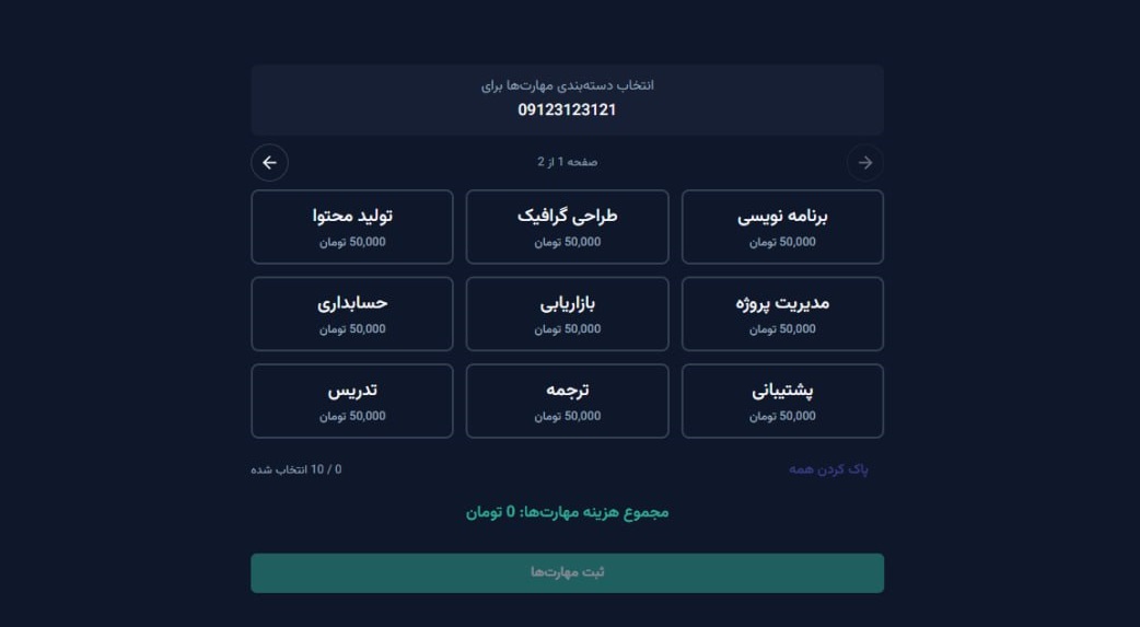 شامل داشبورد کاربران، بخش انتخاب مهارتها و بخش پرداخت جهت ثبت مهارت شغلی.